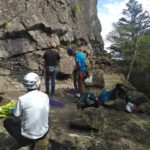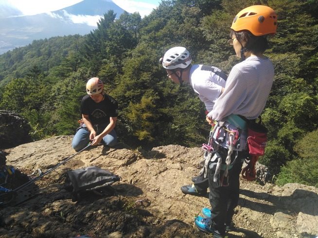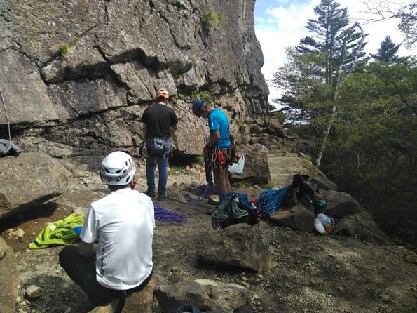 天狗岩に着いた後、準備をし、R.Kリーダーから懸垂下降の説明を受け、2組に別れ2本のロープで行う。
