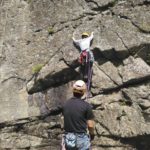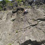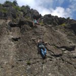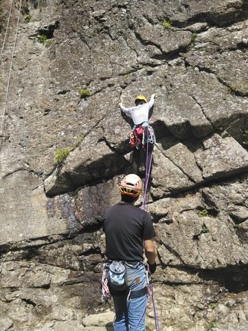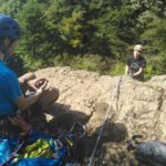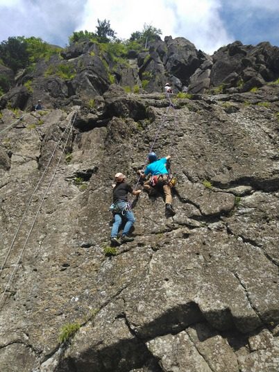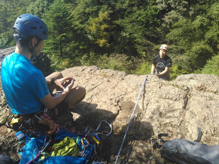 初クライミングにして、初外岩のH.Iさん、懸垂下降で、思っている以上に体がこわばって、体重を確保器に委ねられない様子。