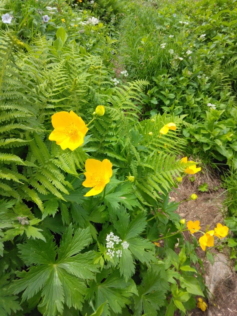 竜の背中のような尾根を登る。登山道に花が咲いていて癒してくれる。