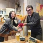 ろうあ者で手話をしている。【300名山達成】の紙を広げて写真を撮っている。