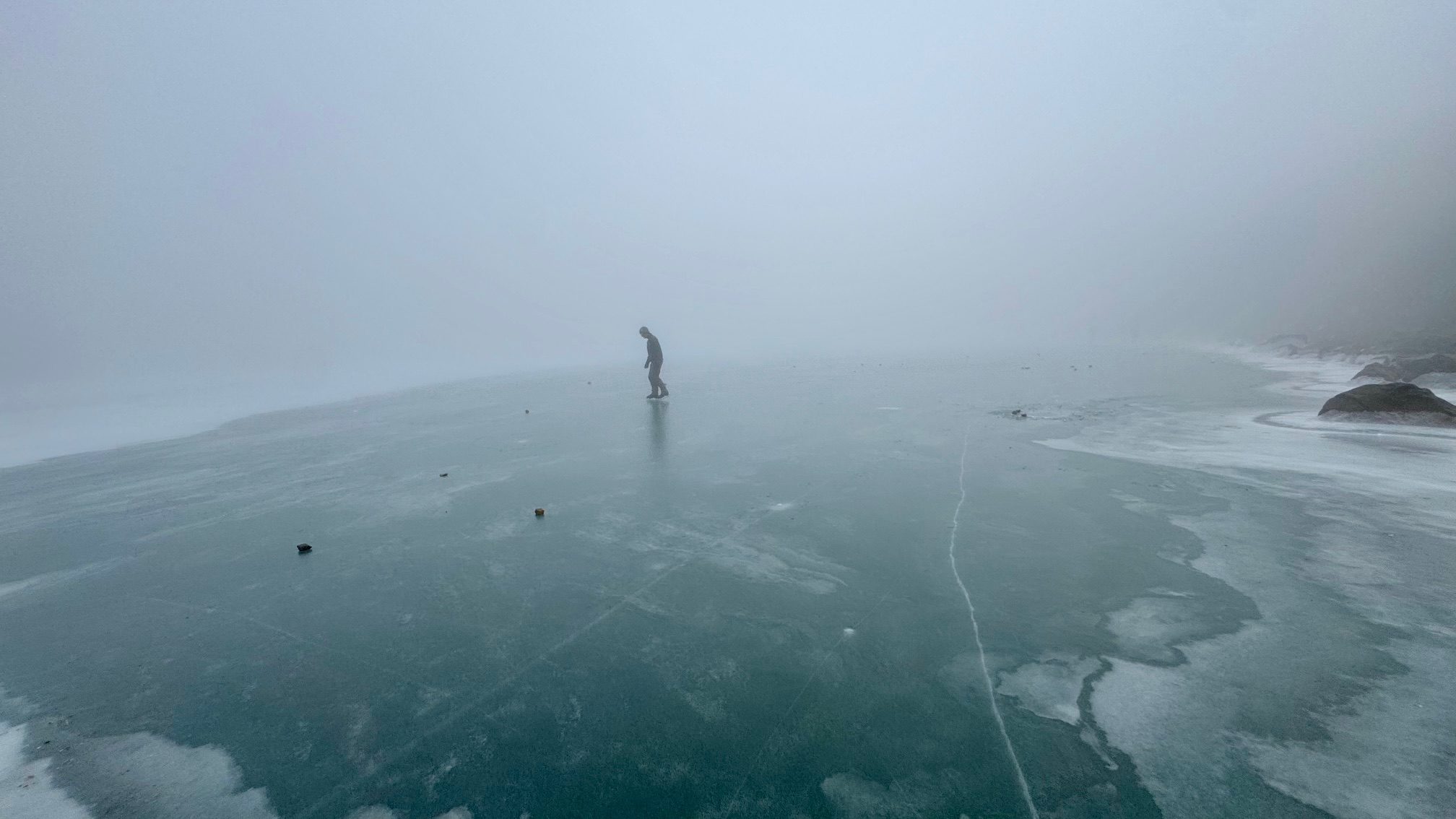地元の人かな?スケート靴を履いて、天然リンクを楽しむ男性。しかも上手。