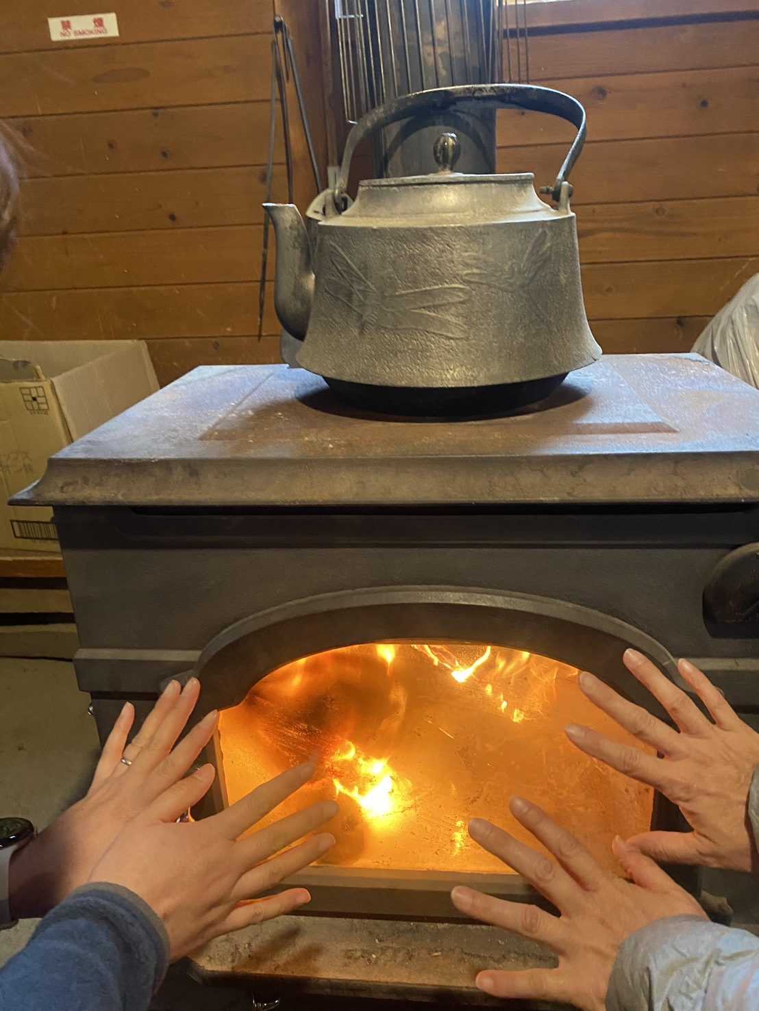 小屋は雰囲気よく夜は寒かったのでストーブをつけてくれました。